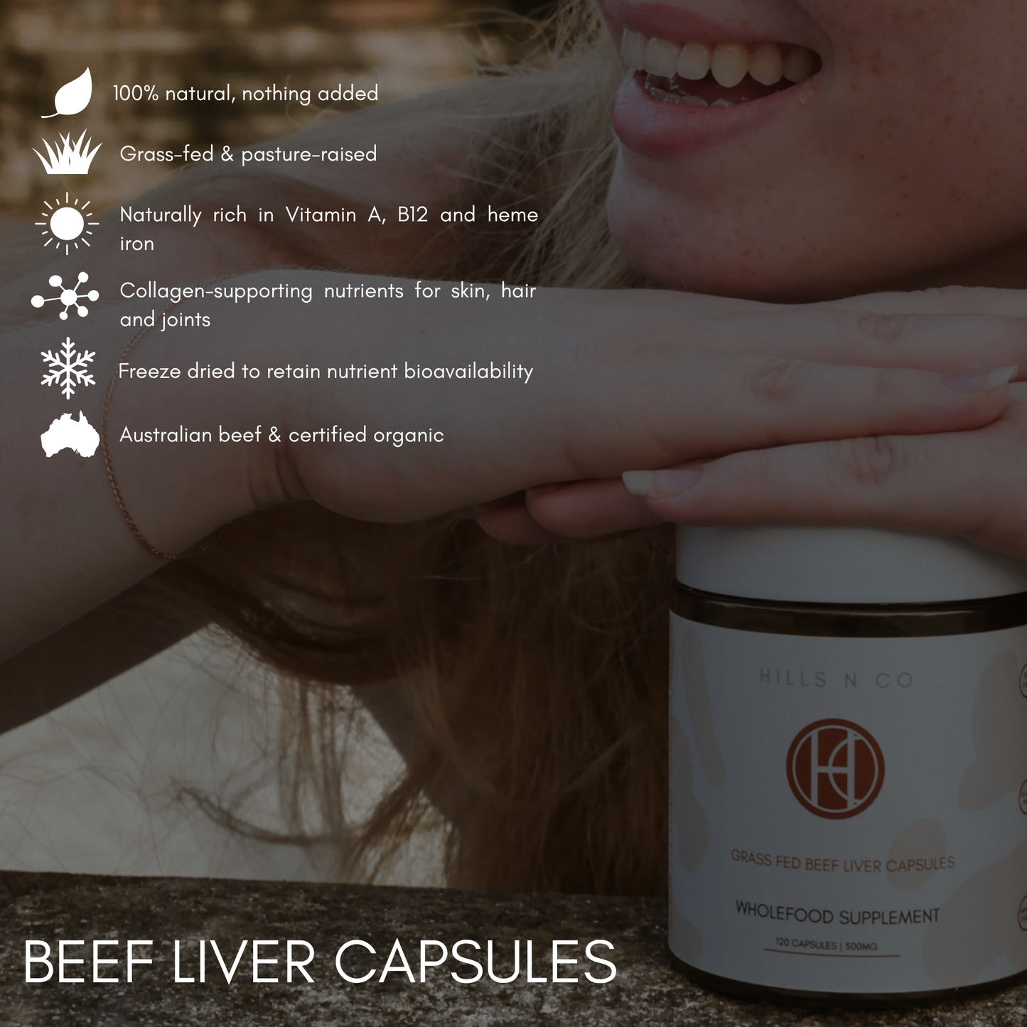 Made from 100% grass-fed, pasture-raised Australian beef liver, freeze-dried to preserve its natural nutrients in a wholefood form. Naturally rich in Vitamin A, B12, and iron to support energy and daily vitality. 120 capsules per bottle.
